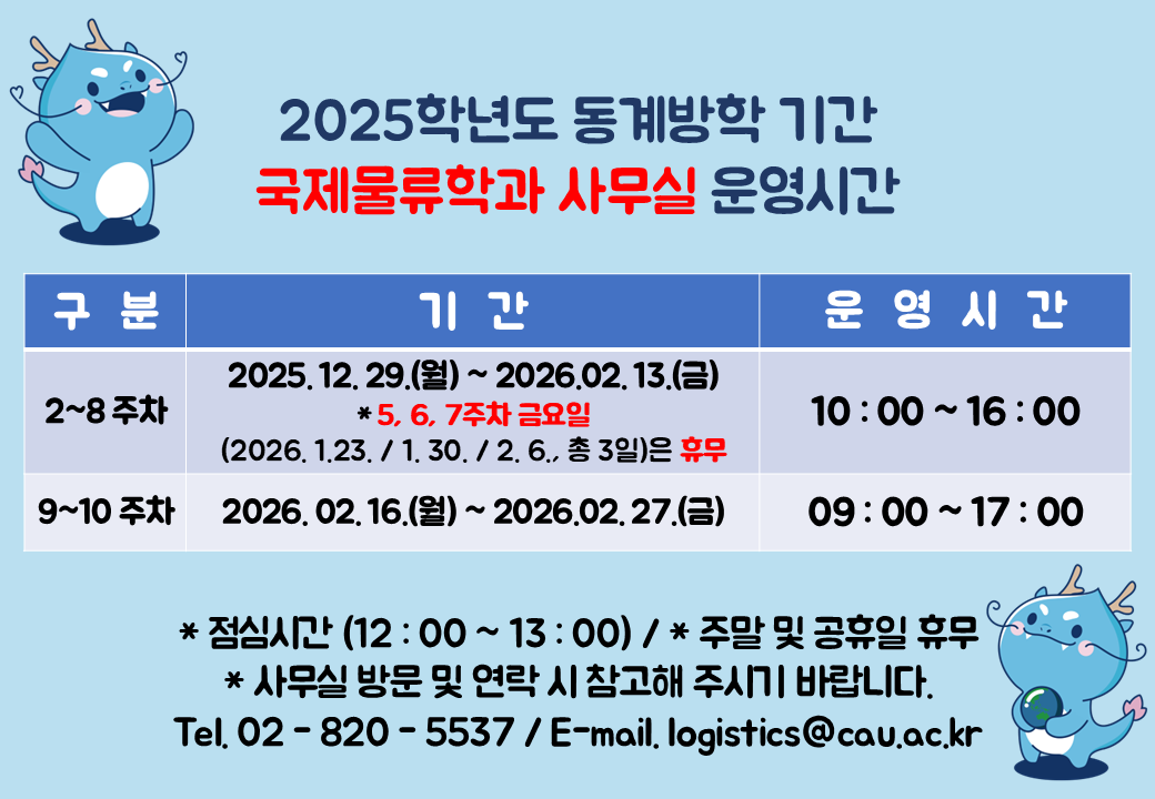 공지사항 2026학년도 1학기 폐강 전공선택 교과목 안내 [물류빅데이터 분석과 머신러닝(영어A)]01-302026년도 국회 대학(원)생 아카데미(1차) 모집 안내01-282026-1학기 다전공 선발 결과01-282025학년도 2학기 졸업논문 합격 발표01-262026년 2월 졸업자 학위기(졸업장) 배부일정 및 장소01-222026년 2월 학부 입학식 일정 안내01-20